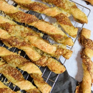 I use both cheddar and parmesan within these cheese straws. Cheddar is my favourite – I love a strong cheddar as I really want to taste the cheese throughout.