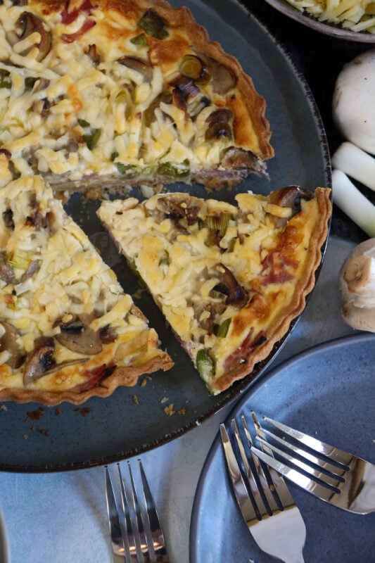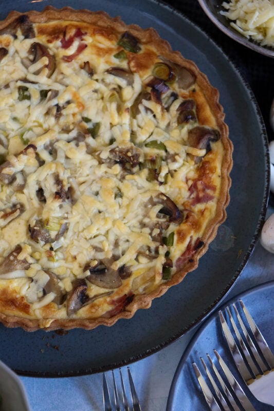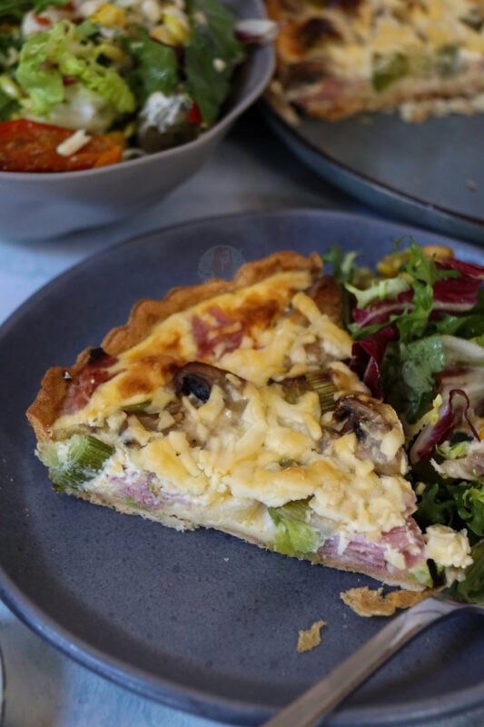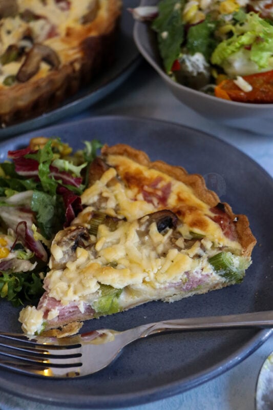 Ham, leeks and mushrooms together provide a delicious quiche fillings, they just all work so well with the egg and pastry! I never used to be a fan of mushrooms in quiche but this flavour combination changed my mind!