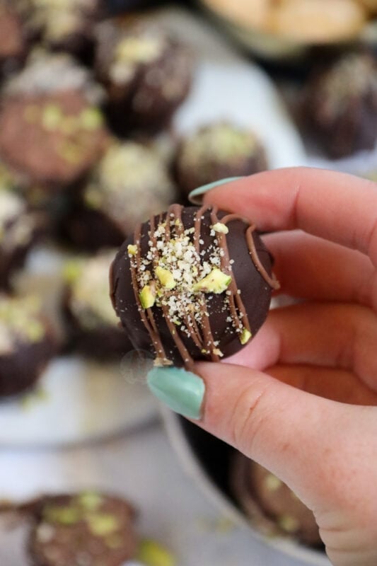 Amaretti, pistachio and rum together is a great combination as you have a chocolatey, slightly boozy truffle with the added texture of the amaretti biscuits and pistachios – they feel so decadent when you eat them! On one hand you want to savour them but on the other hand (which is always me) you cant get enough and must try all the toppings and before you know it, I’m making another batch!