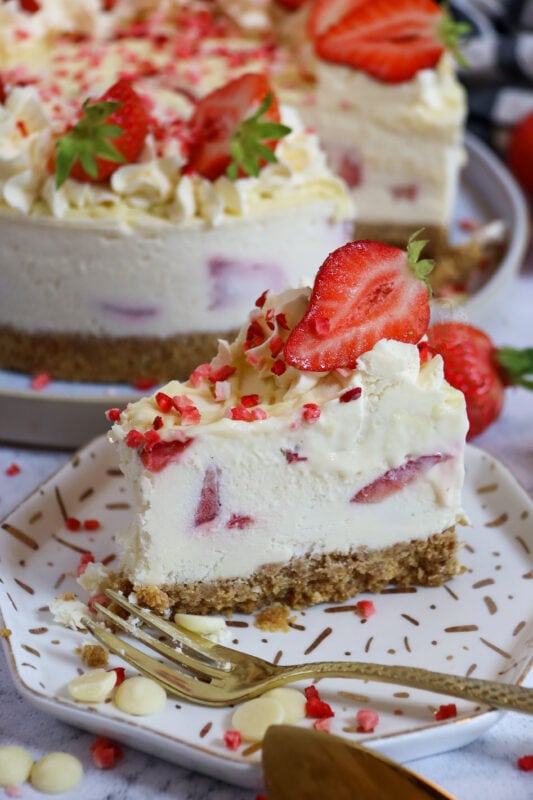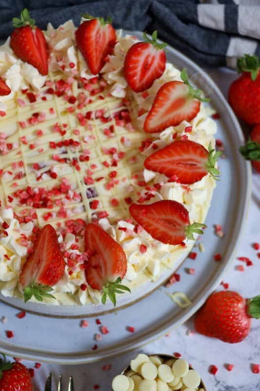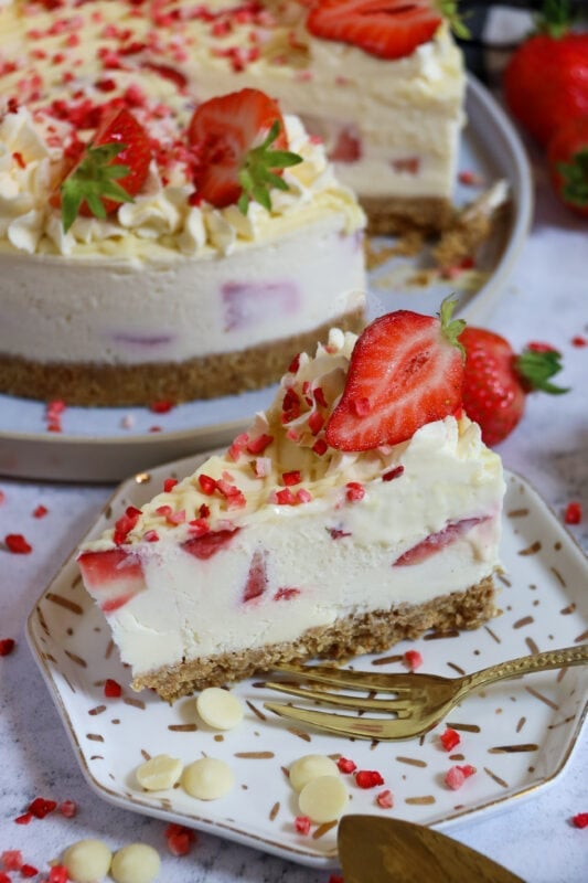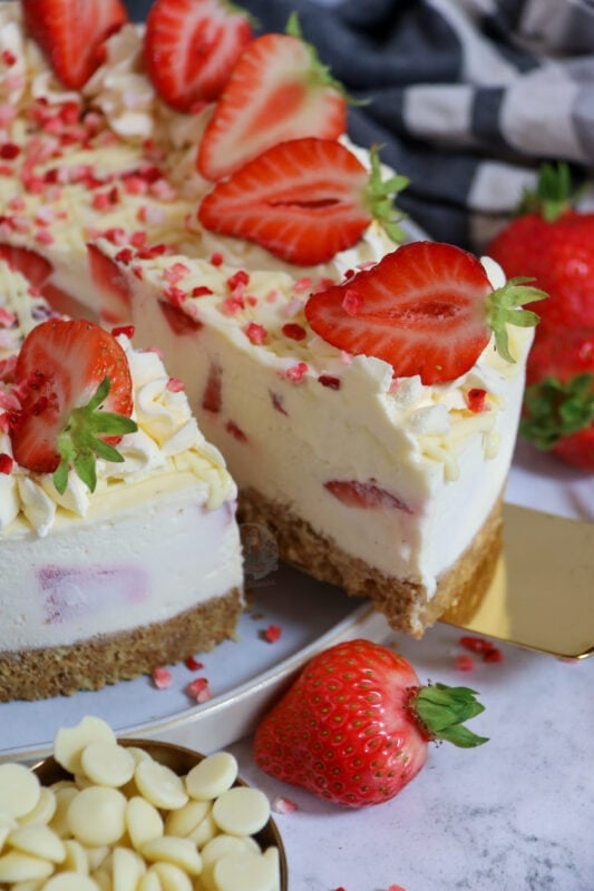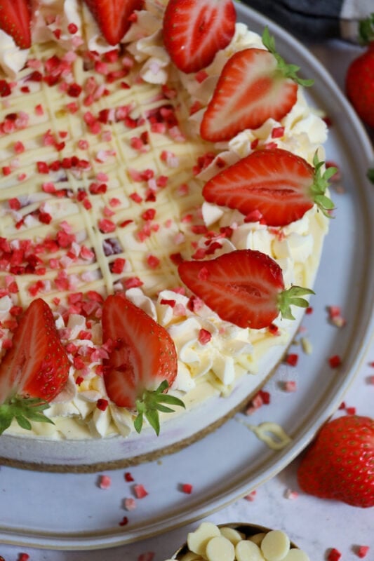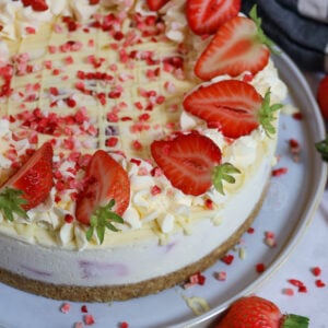 You can decorate (or not decorate if you fancy!) however you like. I personally like some swirls of fresh cream, a drizzle of white chocolate and more strawberry goodness! I love the combination of fresh strawberries with cold cheesecake filling – delicious!
