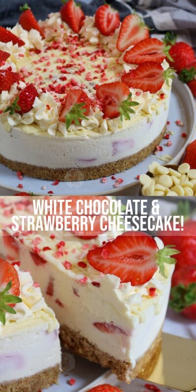 Buttery biscuit Base, white chocolate cheesecake with strawberry filling, whipped cream, more chocolate, and even more strawberry! The most amazing white chocolate and strawberry cheesecake!