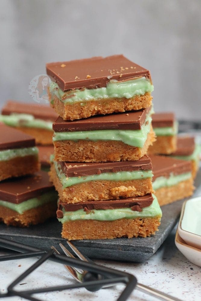 This recipe is so easy to make, and basically the minty no-bake version of millionaires shortbread! You can have the same biscuit base, the same chocolate topping, but you just swap out the caramel for a delicious mint flavour – simple!