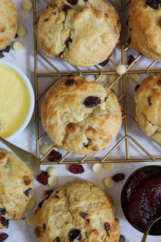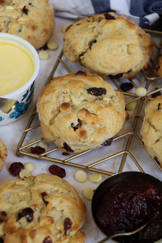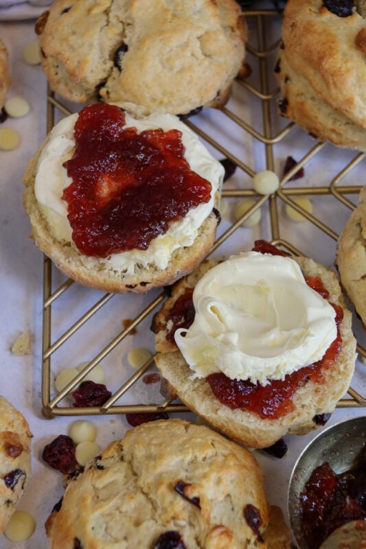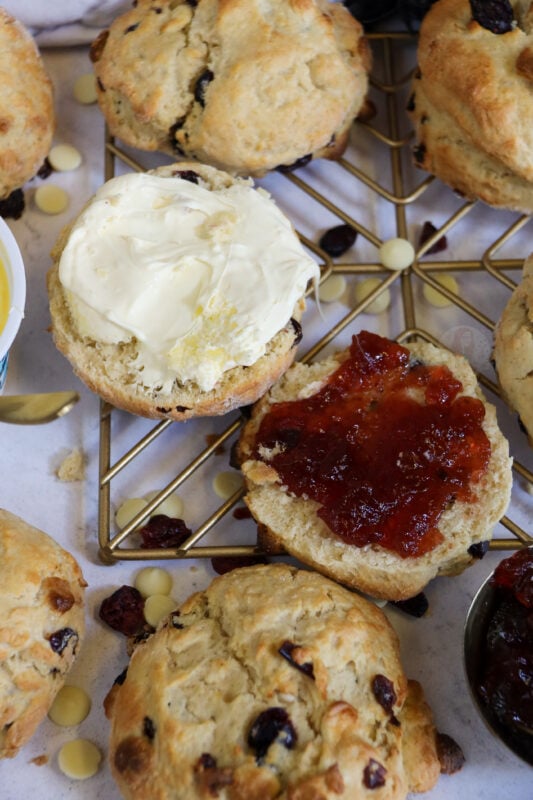 I use my favourite white chocolate in these scones but you can use milk or even dark chocolate if you prefer! As I said, I love the marriage of white chocolate and cranberry however you can adapt the recipe to suit you! Maybe try a different dried fruit? Different flavours of jam always taste delicious on scones so I don’t see why different dried fruits within the scone wouldn’t be delicious too!