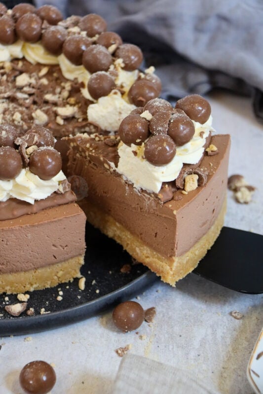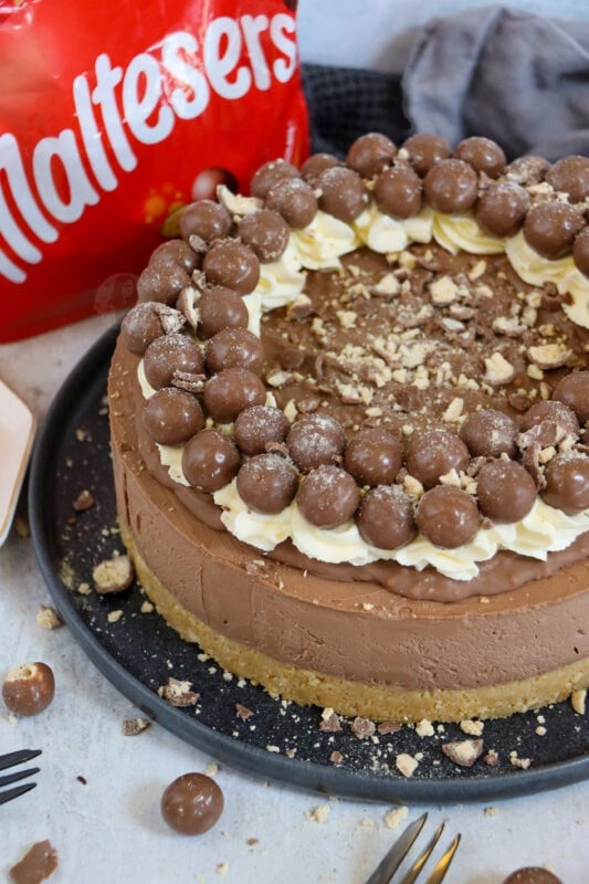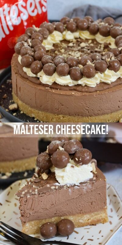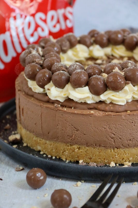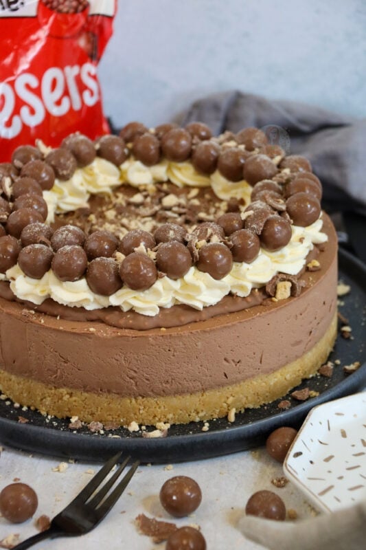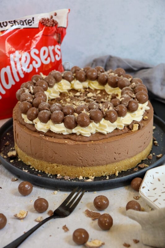 Delicious & chocolatey Malteser cheesecake – malt biscuit base, chocolate malt cheesecake, Malteser spread, sweetened cream, and Maltesers!