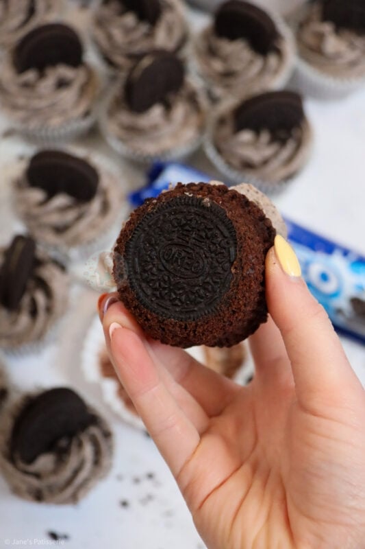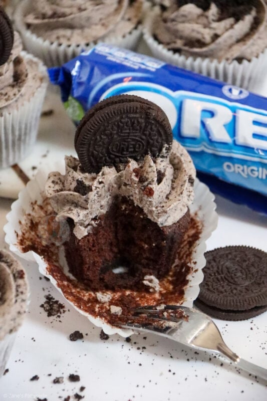 Light & moist chocolate Oreo cupcakes filled with a whole Oreo, Oreo buttercream, and even another one on top!