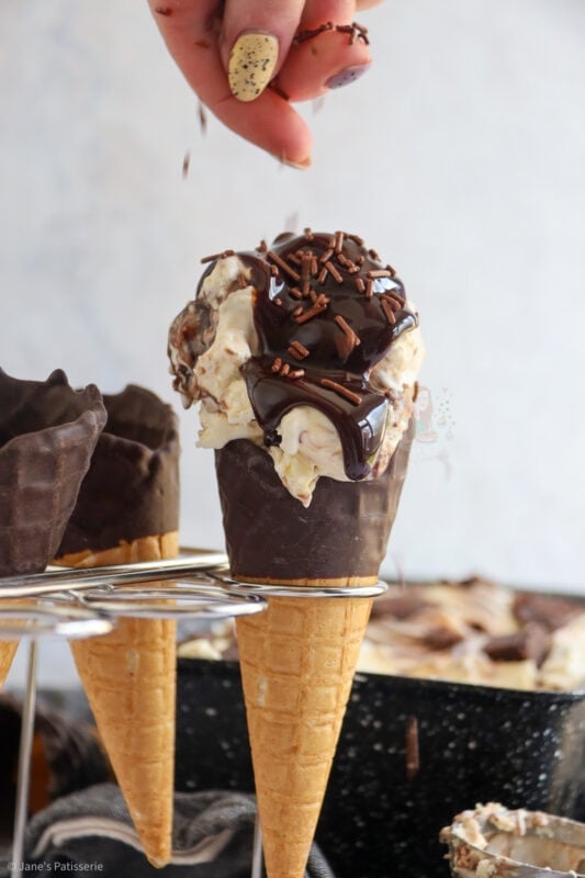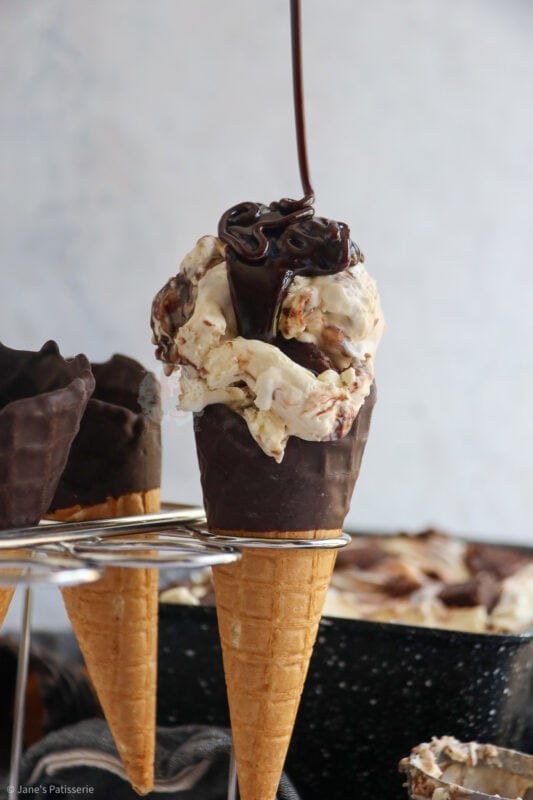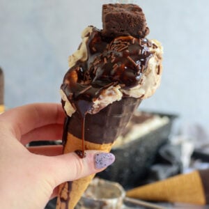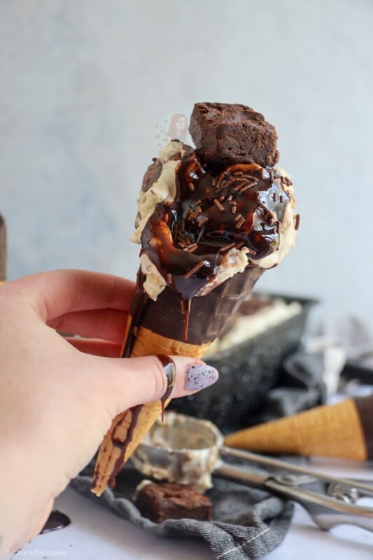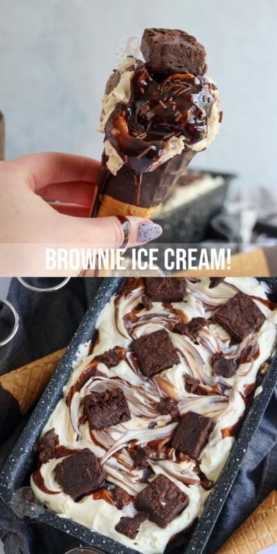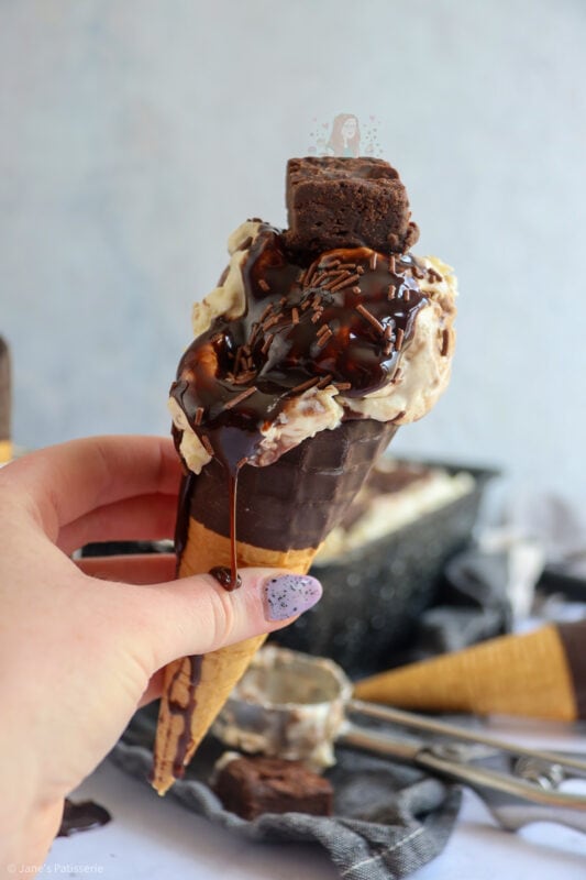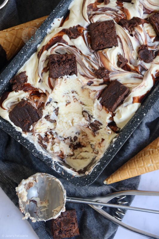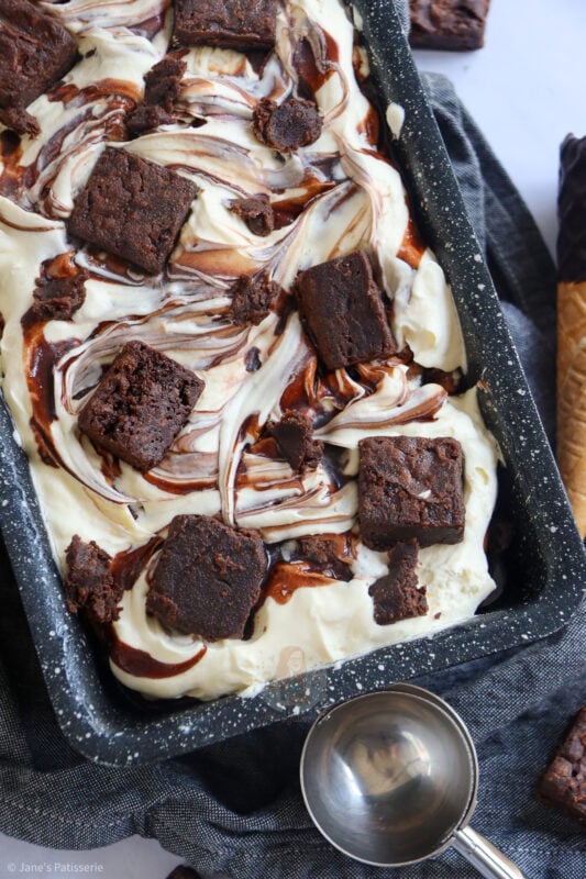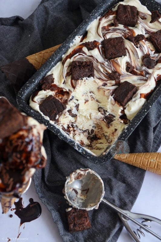As this is a no churn recipe, you don’t need an ice cream maker… obviously. However, if you have one, you can still use it! You just need to whisk the ice cream ingredients in a bowl, add to the ice cream maker and click go. Then, swirl into a container with the brownie and sauce after it’s frozen instead.