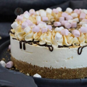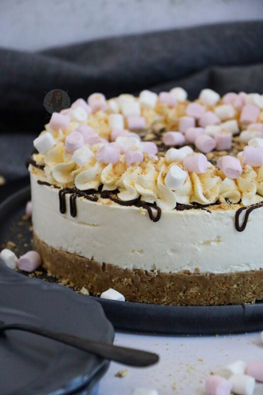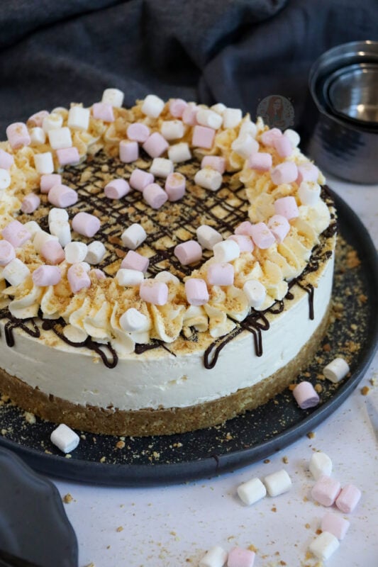 No-bake s’mores themed cheesecake with marshmallow fluff – topped with toasted marshmallows, crushed biscuits & melted chocolate!