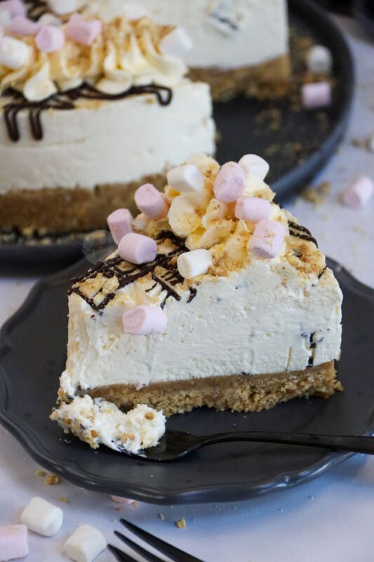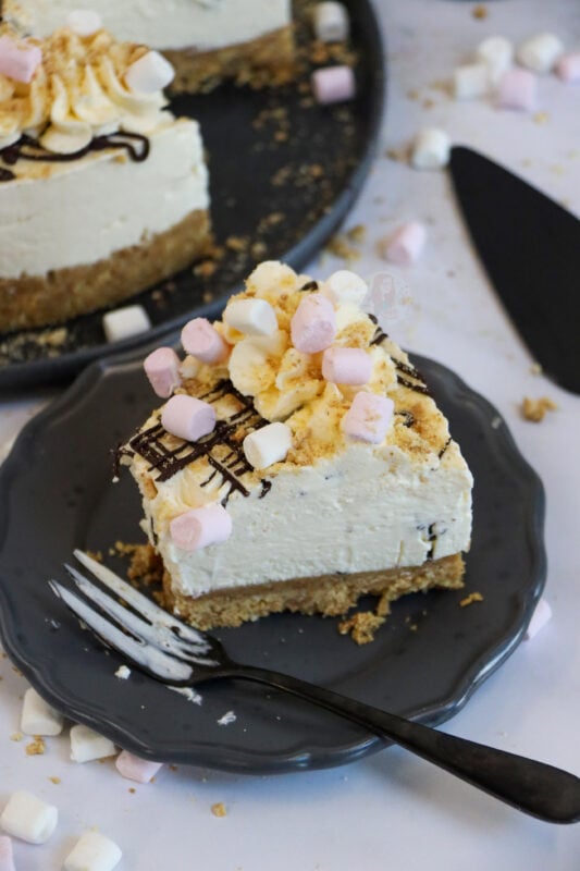 This cheesecake has a creamy mascarpone cheesecake filling which is silky smooth and compliments the addition of marshmallow fluff PERFECTLY! With the added chocolate drizzle, marshmallow and biscuits crumbs for decoration, this is exactly what you want from a s’mores bake – a perfect mash up of all things sweet!