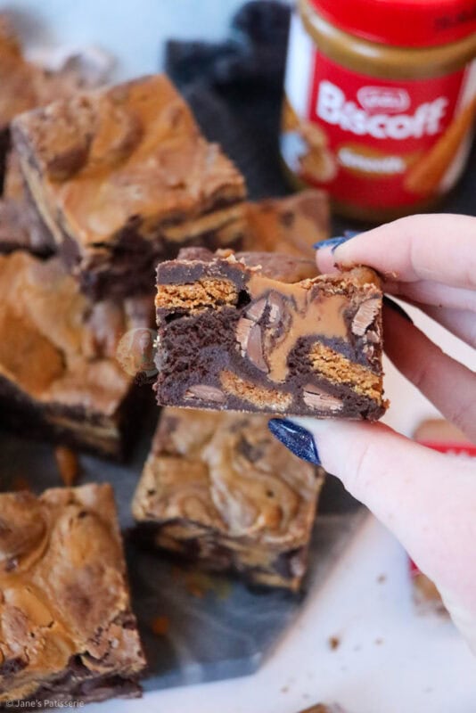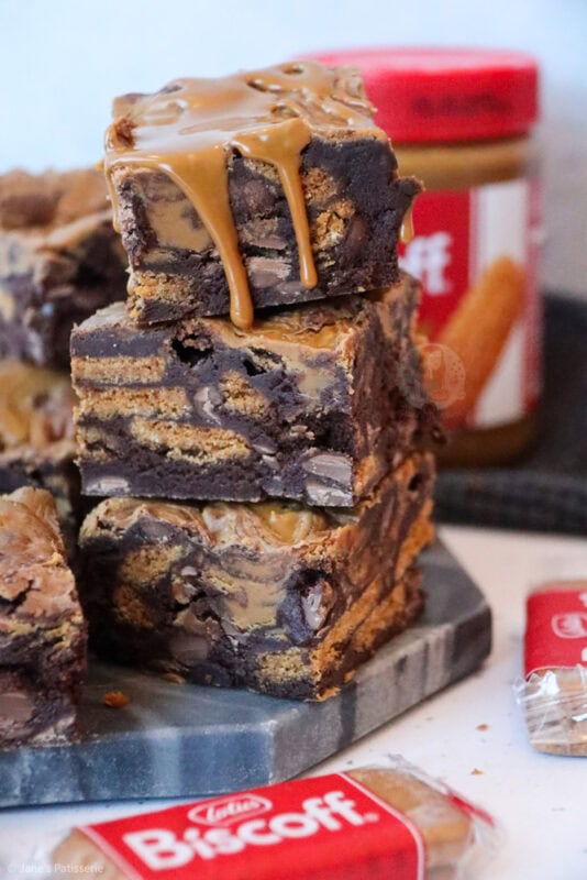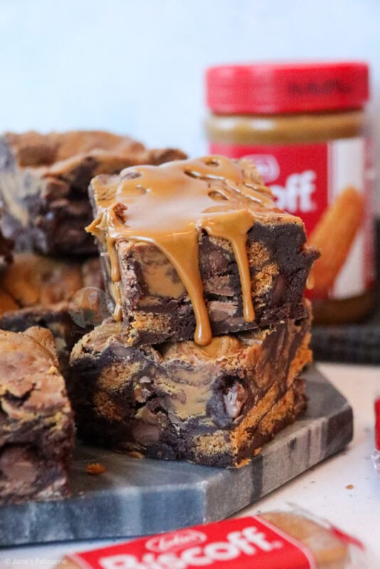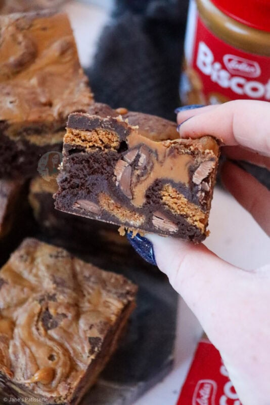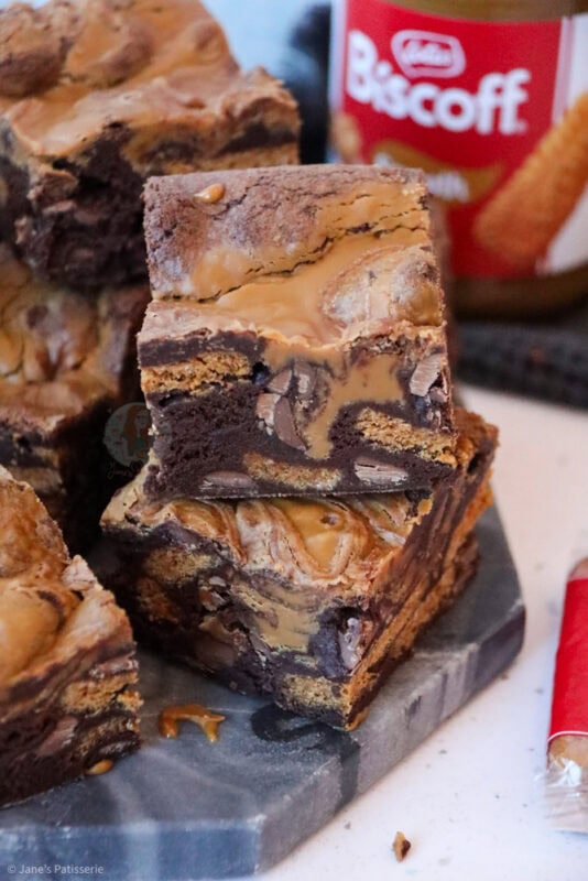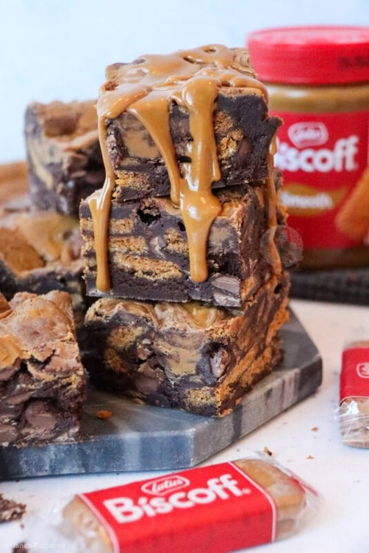 The brownie recipe I use in this recipe is the same recipe that I use in my triple chocolate brownies as they worked so well being swirled with another flavour that it seemed appropriate to use it again. Just add in a rather insane amount of Biscoff spread and Biscoff biscuits and you have a winner.
