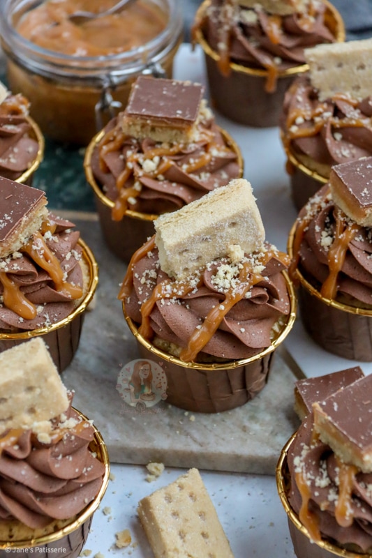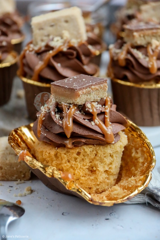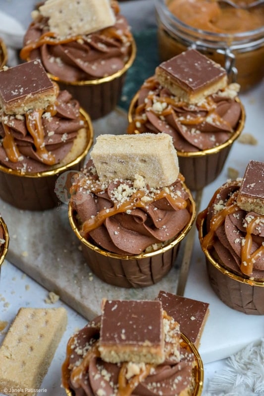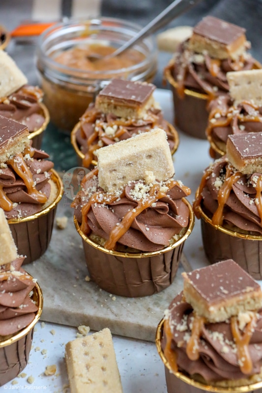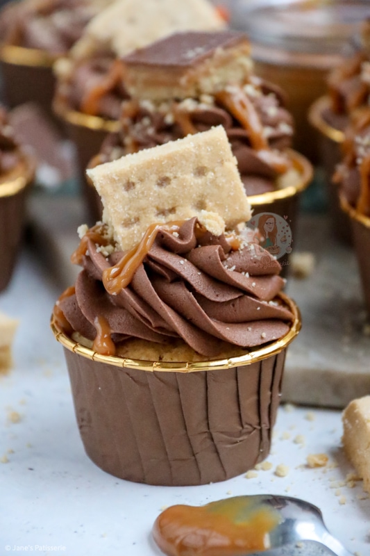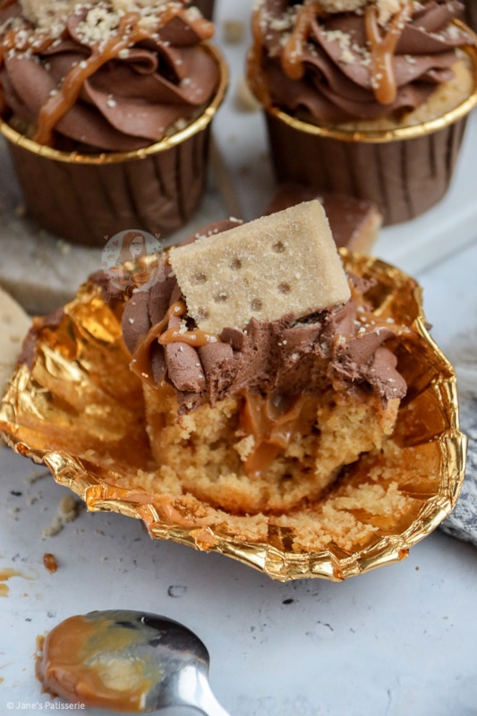 The moist brown sugar vanilla sponge has a hidden caramel centre, topped with a light and fluffy chocolate buttercream. HELLO! I did think that maybe I should stop here, but I couldn’t go on without any shortbread. Crumbles of shortbread and a whole piece top the cupcakes off. Perfection.