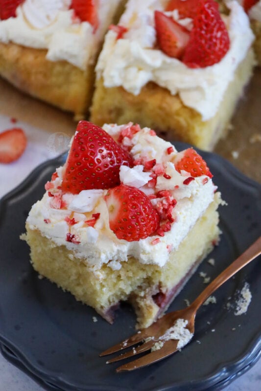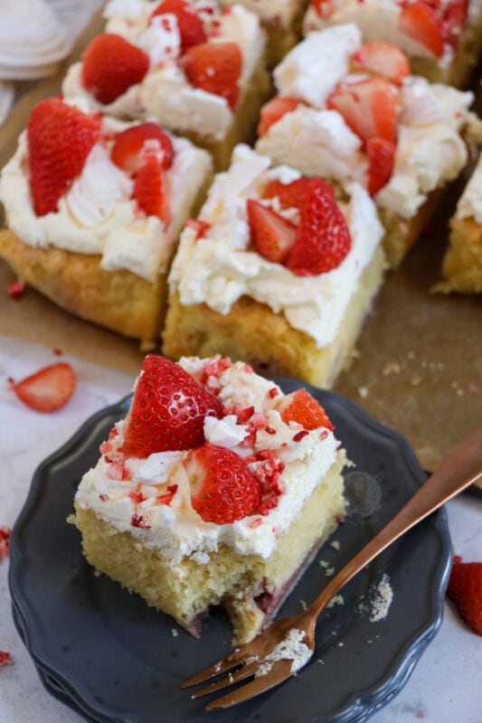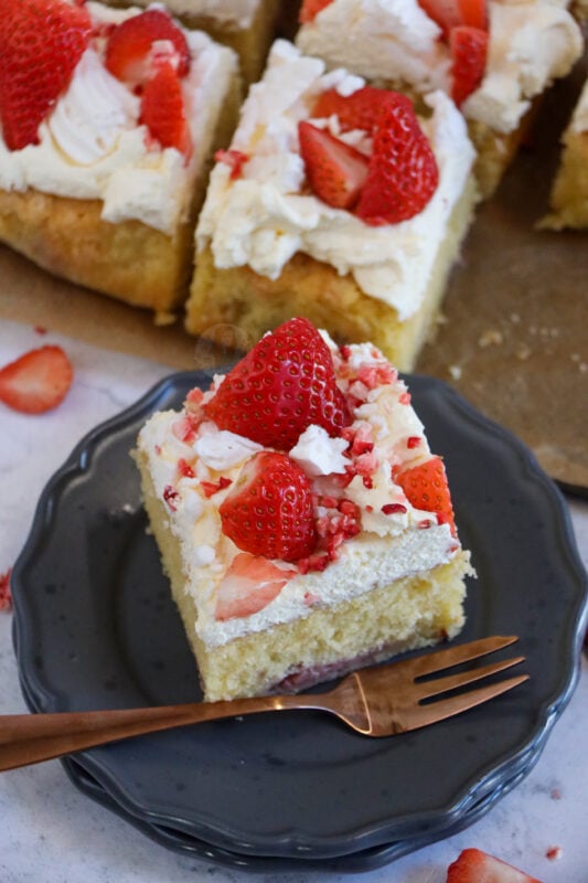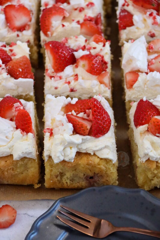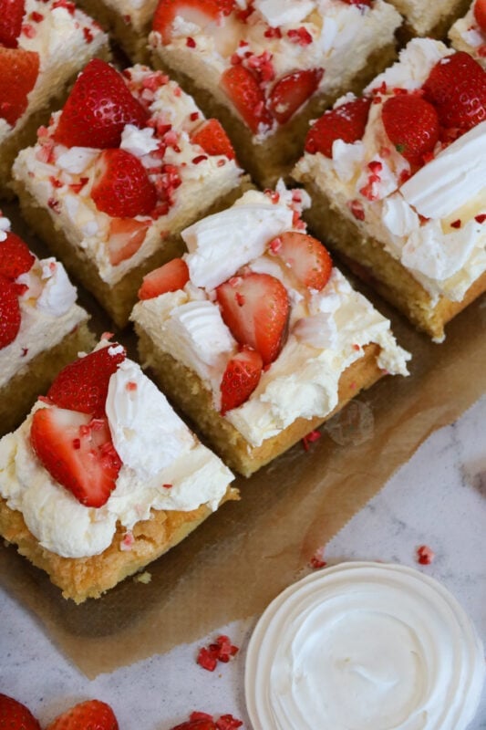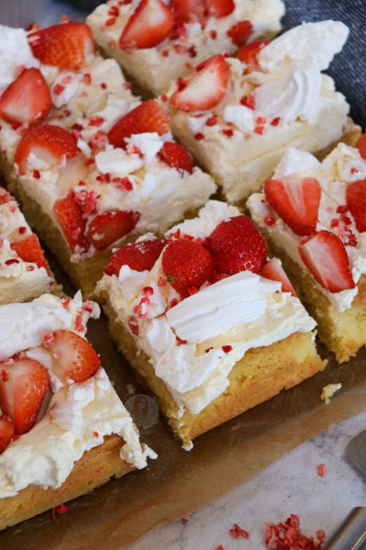 I did some research into other recipes and some included meringue in the sponge, and some were just vanilla sponge with no strawberries, so I decided I would try the in-between. My Eton mess layer cake is lovely, and fresh, and delightful… but sometimes a traybake cake is better. My carrot cake traybake and chocolate traybake cake are some of my most popular posts!