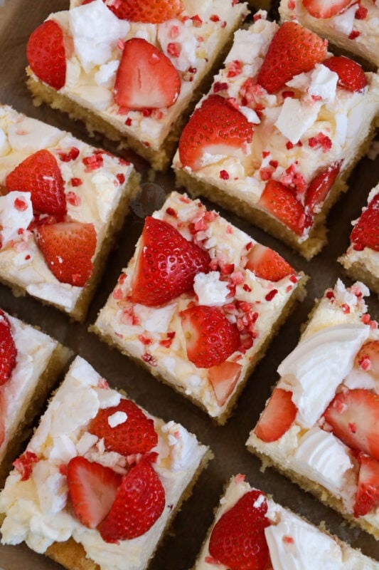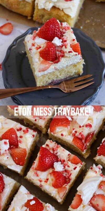 An Eton mess traybake with a fresh strawberry & vanilla sponge and everything Eton Mess – fresh cream, meringues, and even more strawberries!