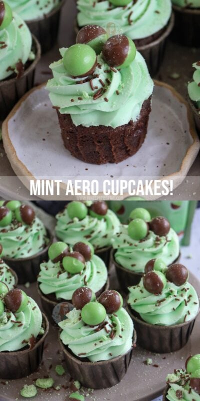 Minty & delicious chocolate chip cupcakes, topped with a mint buttercream and mint aero bubbles make seriously yummy mint chocolate cupcakes!