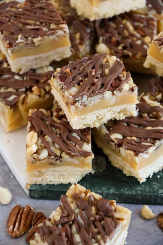 A buttery rich shortbread topped with homemade salted caramel, nuts and of course a chocolate drizzle too!