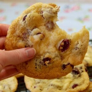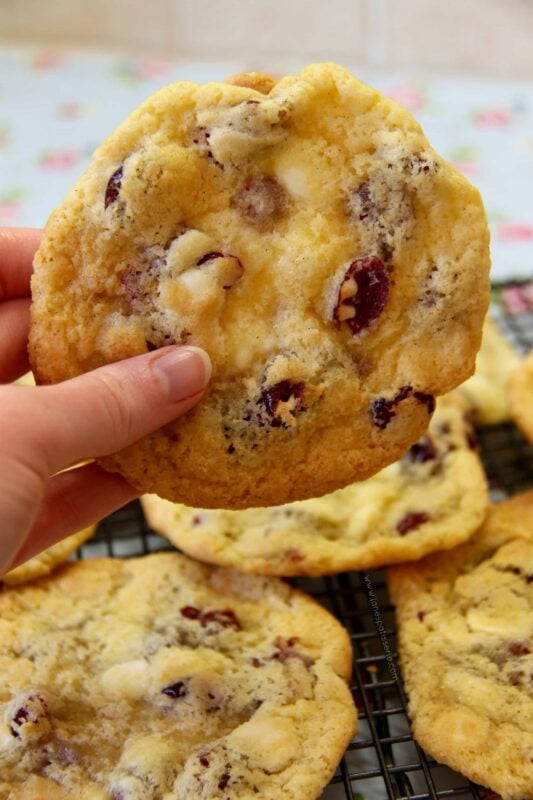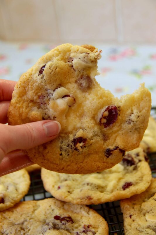 Delicious crunchy and soft cookies filled with delicious white chocolate chunks and dried cranberries – perfect with a cuppa!