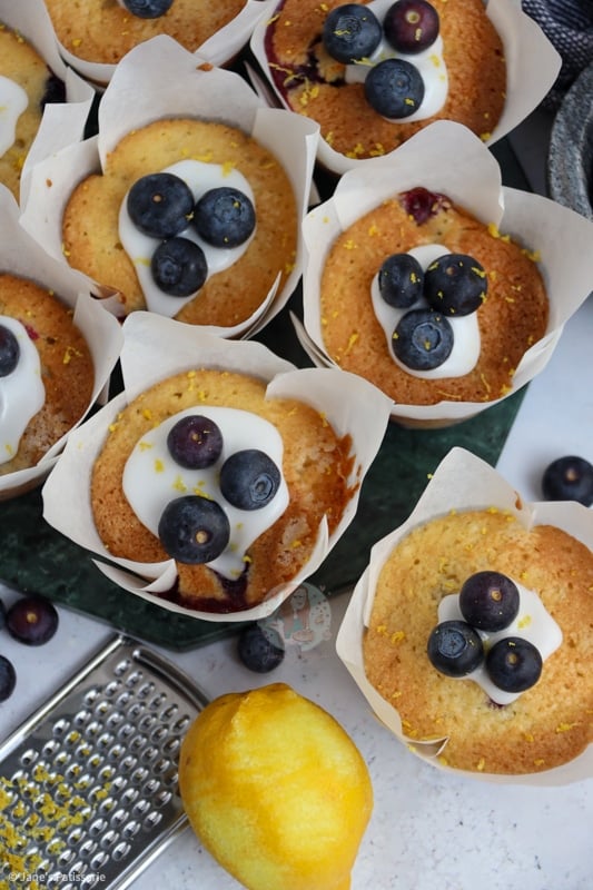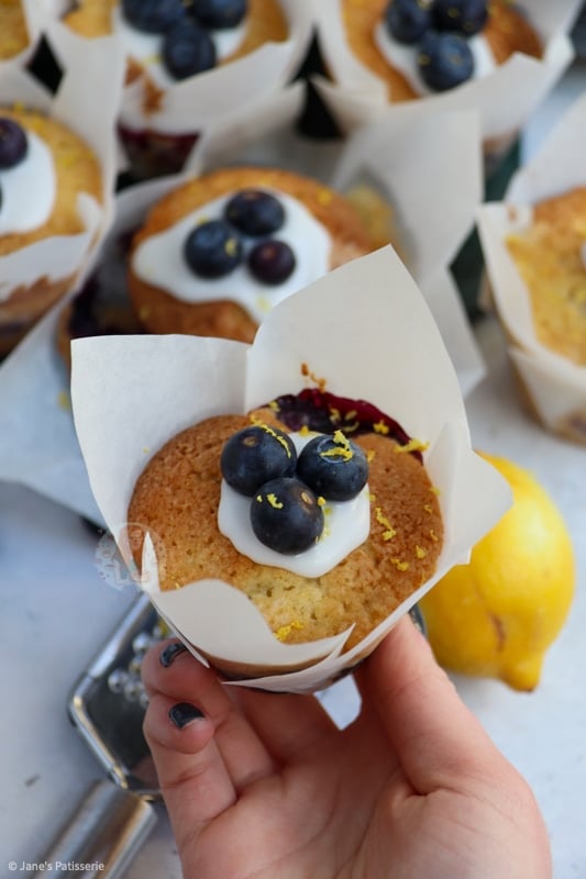 For these muffins I use unsalted butter, eggs, caster sugar and self-raising flour, salt and milk. You then fold in your lemon and blueberries and bake – it really is that easy. I use fresh blueberries with this bake as I believe not only do they work best but you cant beat the taste of fresh, juicy blueberries.