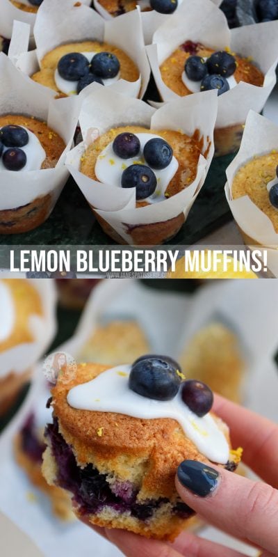 Moist & decadent lemon & blueberry muffins full to the brim with blueberries topped with a lemon icing – perfect summer bake!
