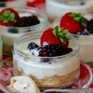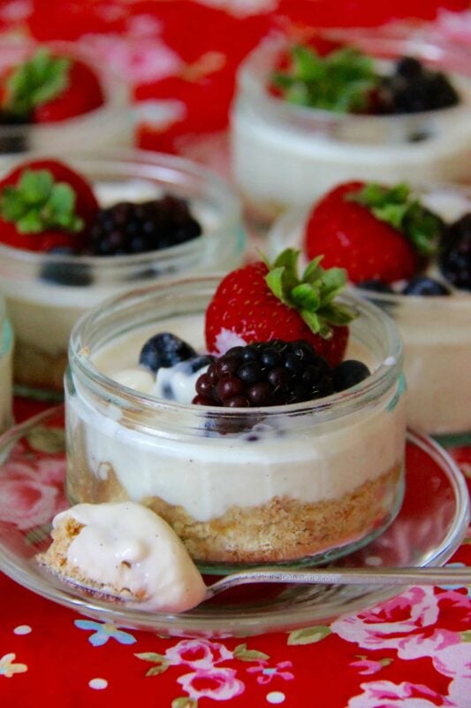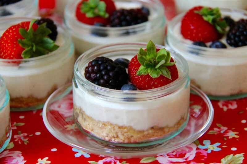 These mini cheesecakes are delicious, and the perfect amount of sweetness – but no they aren’t entirely fat free, they are just lower in fat, especially in comparison to my other recipes! I make them mini so that its easier to portion control, but it can easily be made it to a larger cheesecake dish, just serve it in a bowl, or a trifle dish for example.