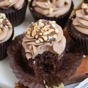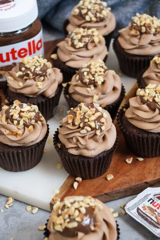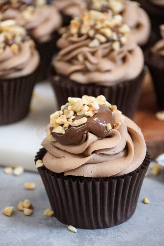 Chocolatey cupcakes dotted with hazelnuts, topped with a creamy & delicious Nutella buttercream frosting with Kinder Bueno… amazing Nutella cupcakes!