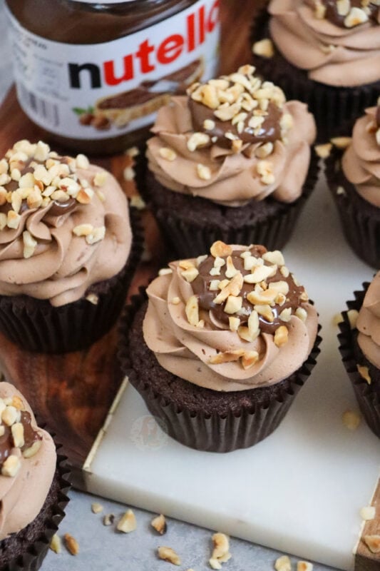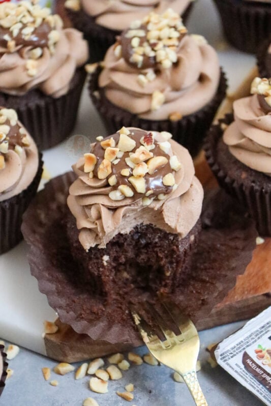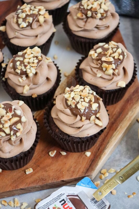 I then created a Nutella buttercream to go on top, and topped that with some extra hazelnuts and a piece of Kinder Bueno! Honestly, you can change this up if you wanted… anything chocolate or hazelnutty would taste great!