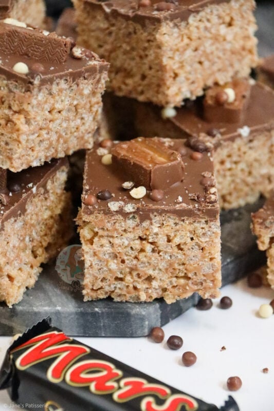 A delicious no-bake mars bar crispy square with marshmallows, mars bar, chocolate and Rice Krispies.