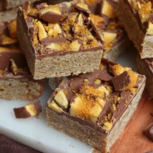 Absolutely delicious…. Chewy flapjack then a chocolatey honeycomb crunch. My family and work colleagues devoured these and have requested more. I am looking forward to playing around with different toppings now I have the perfect flapjack base recipe. Thank you.