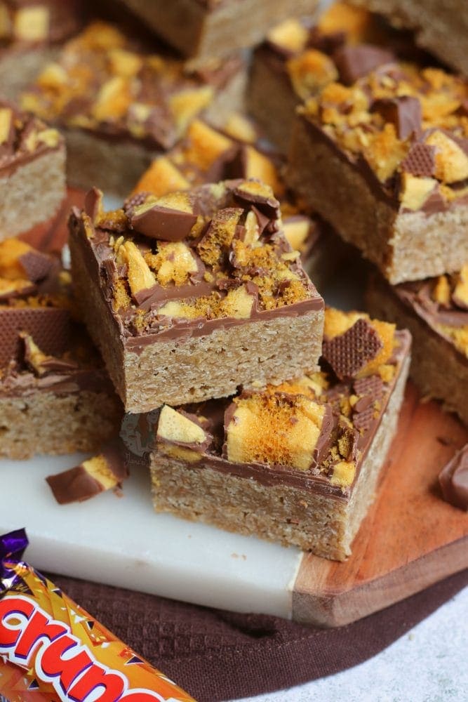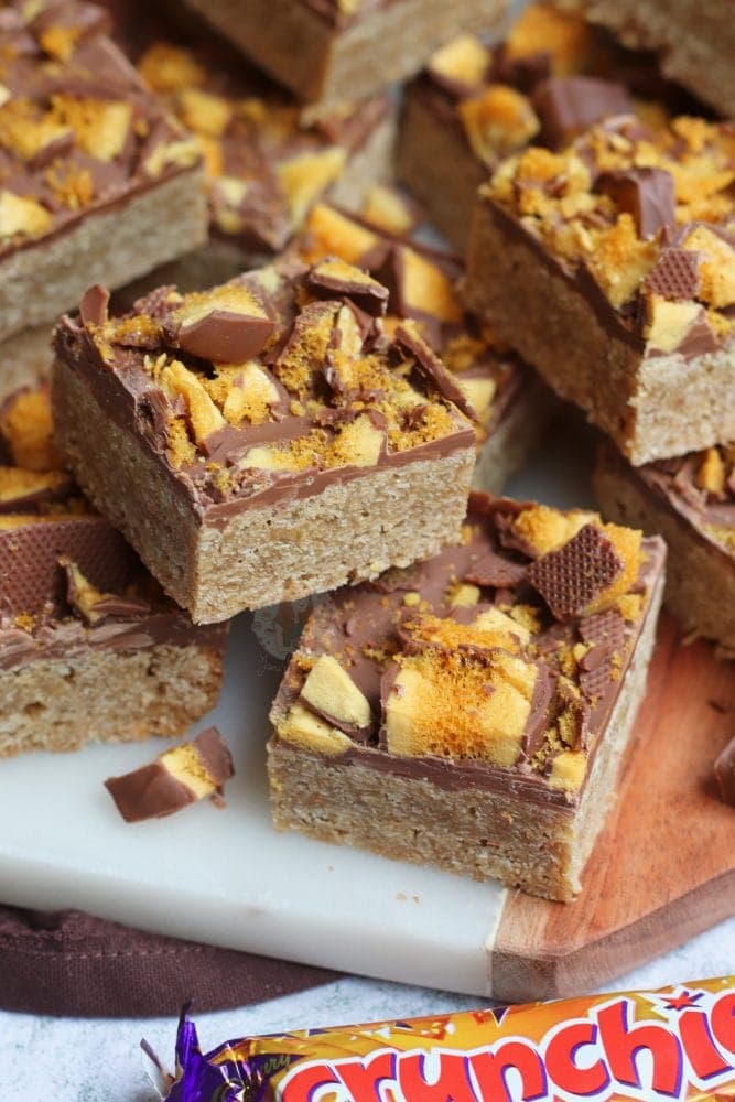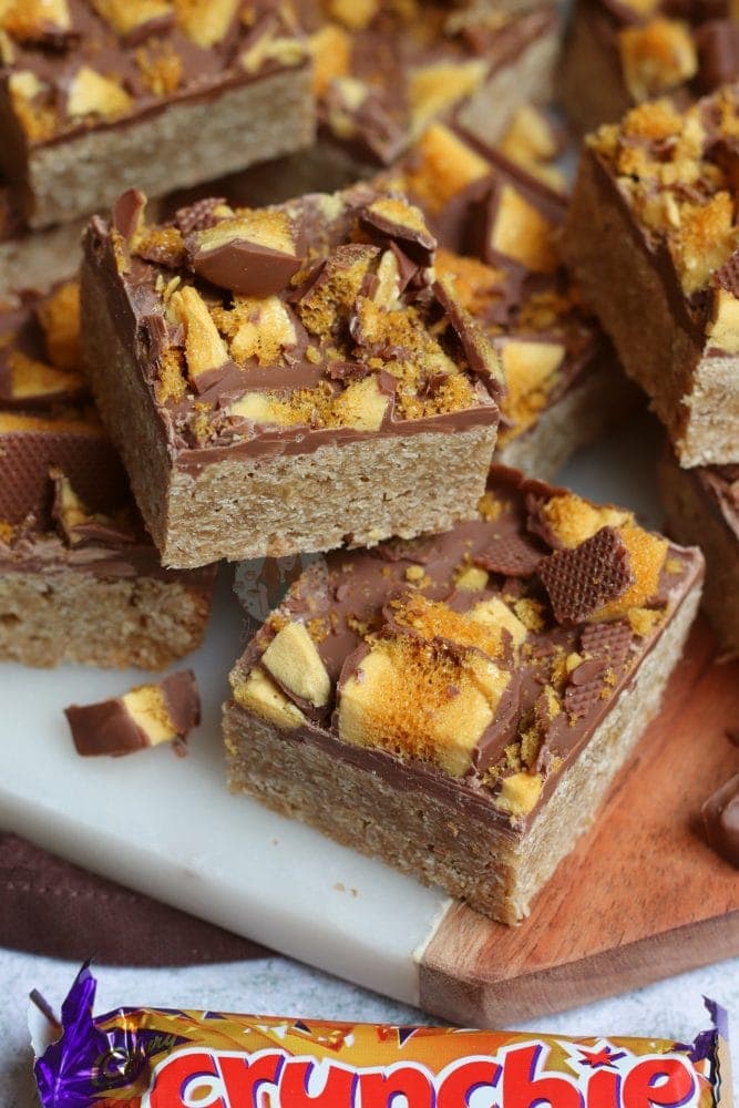 I make this but I do not use crunchy bars, I make my own ‘crunchy’ cinder toffee, mix half in with the flapjacks and then mix the rest with chocolate and put it over the top.