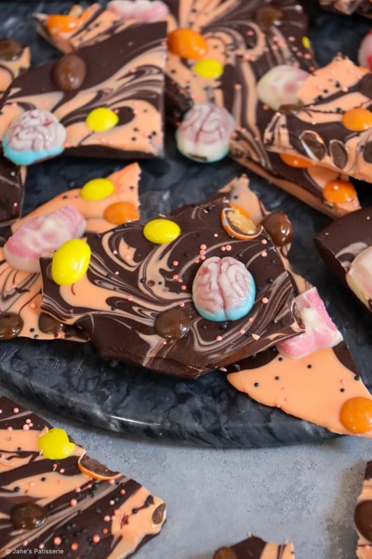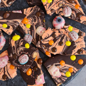 The wonderful thing about this is that you can cater the bark with whichever sweets you want. I find it easiest to buy a larger bag of spooky halloween sweets online and then use some random shop bought bits.