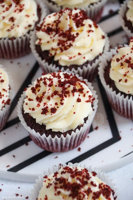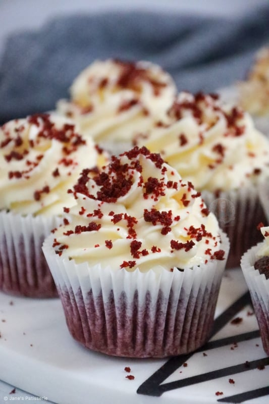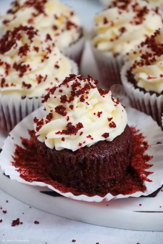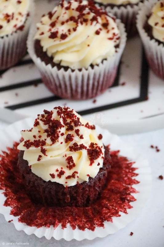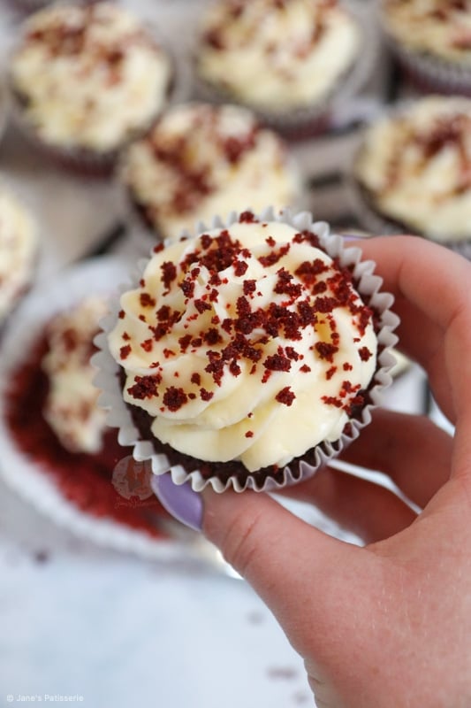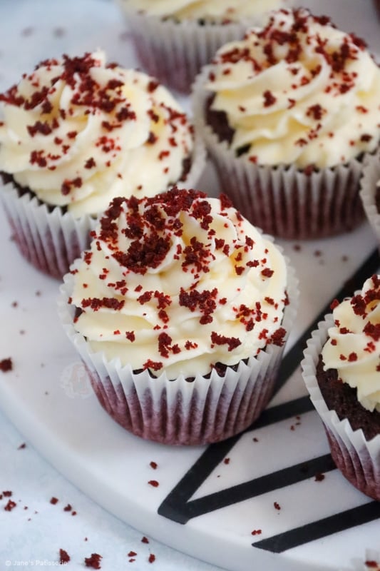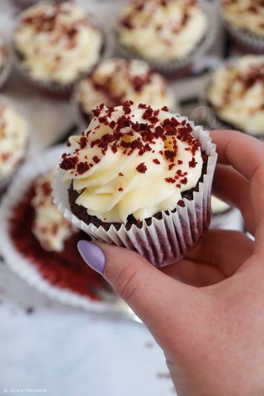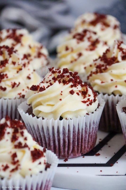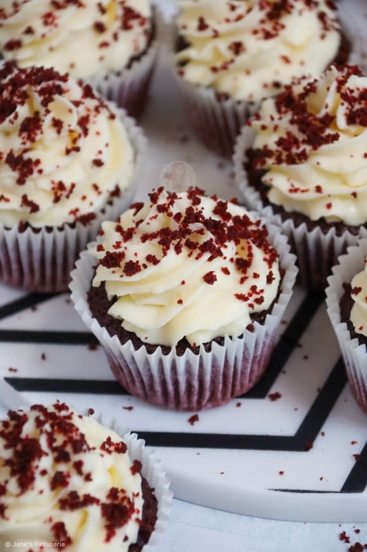 I was flabbergasted with how red my cupcakes came out – such as they look like they have been edited beyond belief, but they really are that red! It’s mind-blowing! Don’t they look cute! Look at the sprinkling of the red velvet crumbs – they’re just so red!