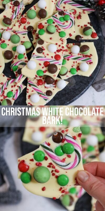 Delicious Christmas themed white chocolate bark full of all of your favourite sweets – perfect homemade gift idea!