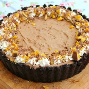 - Decorate the pie with some whipped cream then sprinkle on the spare crunchie bar and little pieces of grated chocolate