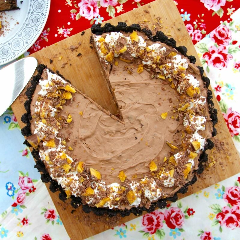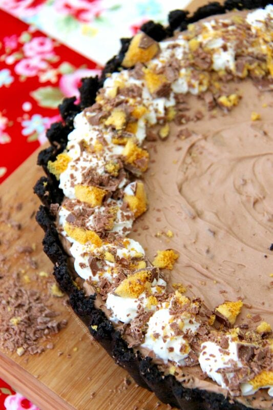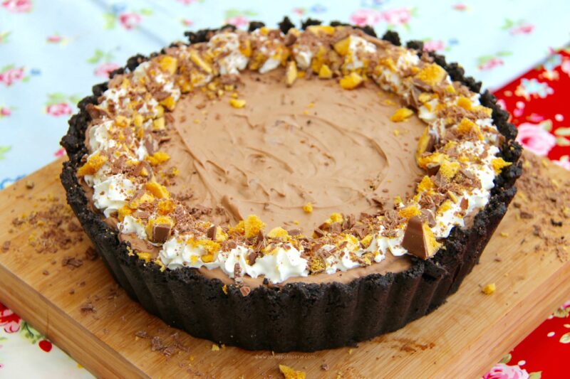 This delicious dessert has an oreo crust that is super easy to make, and its filled with a YUMMY chocolatey cream filling, full of delicious honeycomb pieces. Like seriously, what could be better?!