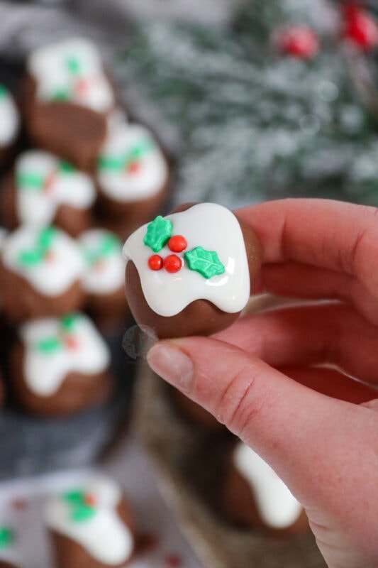 They are covered in a delicious milk chocolate shell, drizzled with a white icing, and decorated with mini holly leaves! Everyone always gives such good compliments about these – and they are the perfect little gift for Christmas! I do struggle to share them slightly, as they’re just delicious to be honest.