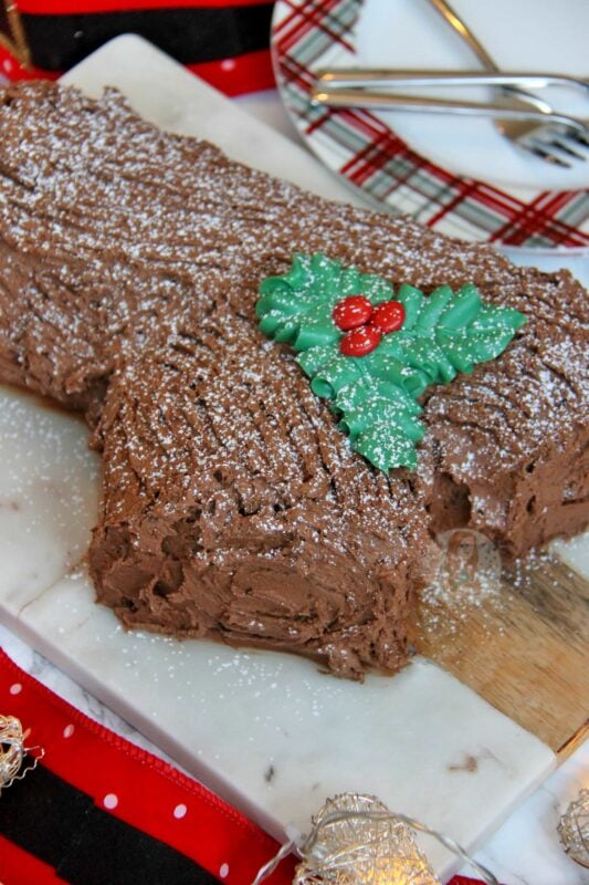 A Chocolate Bûche de Noël Cake decorated with utterly delicious Chocolate Frosting – Perfect Chocolate Cake for the Christmas Season!