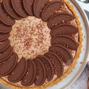 A DELICIOUS no-bake Terry’s chocolate orange tart – a no-bake biscuit crust, and a creamy chocolate orange filling… heaven!