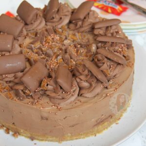 - Using a Piping bag and a 2D Closed Star Piping Tip, pipe on the chocolate cream to decorate, and place a mini Daim Bar on each of the rosettes!