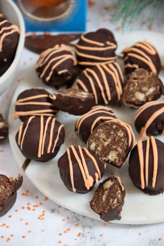 The truffle mix itself is a lot simpler than most, and I wanted to keep it that way as I didn’t want to overpower the flavour of the chocolate orange! I did however, like the Oreo chocolate truffles, use a biscuit in the middle so that they were bulked out a bit more, and I find they are far easier to shape when biscuit is involved!