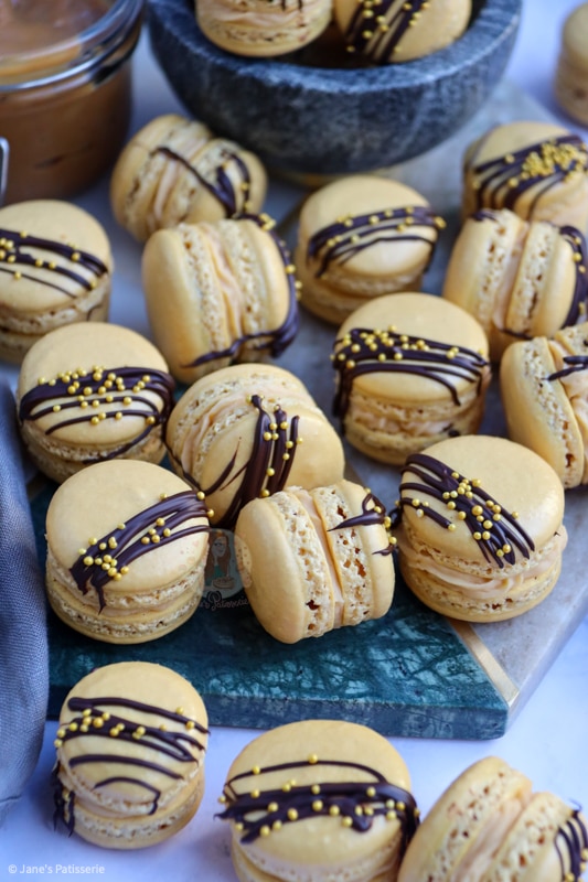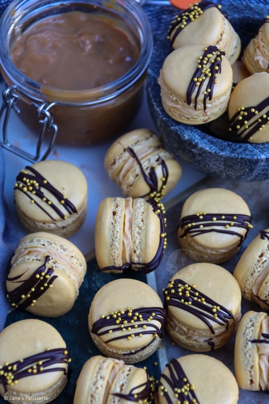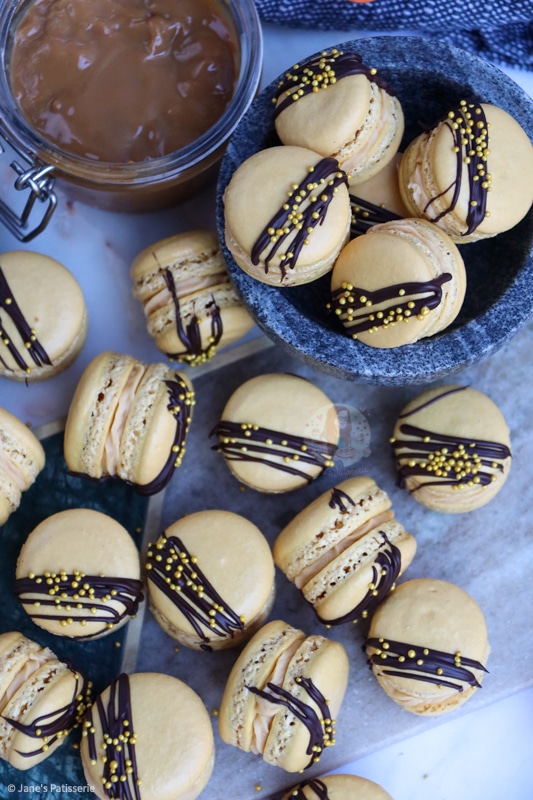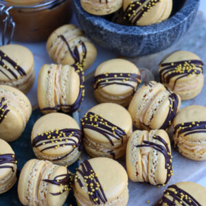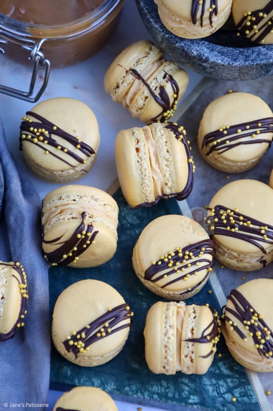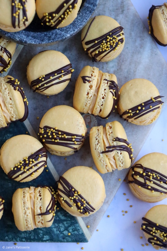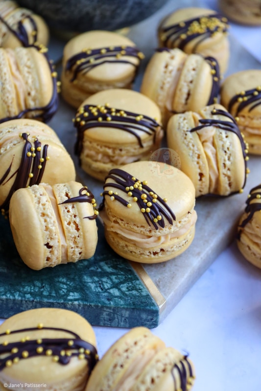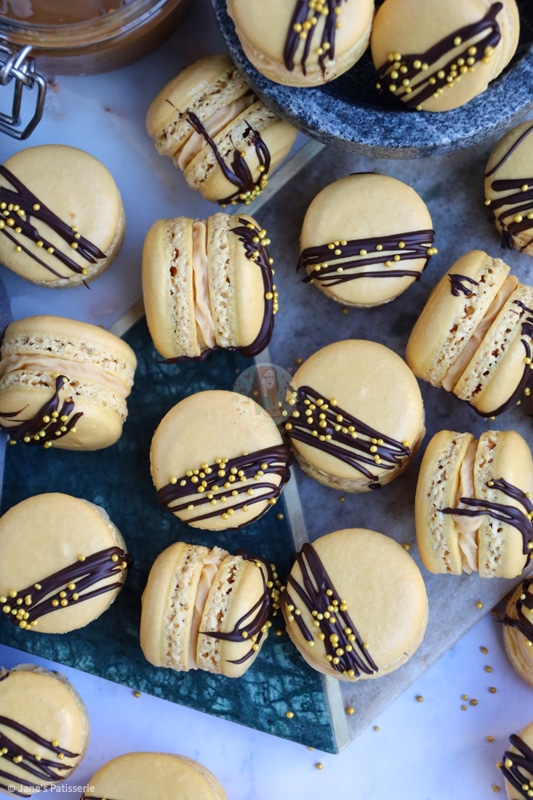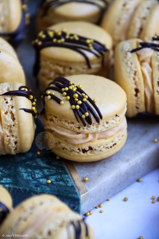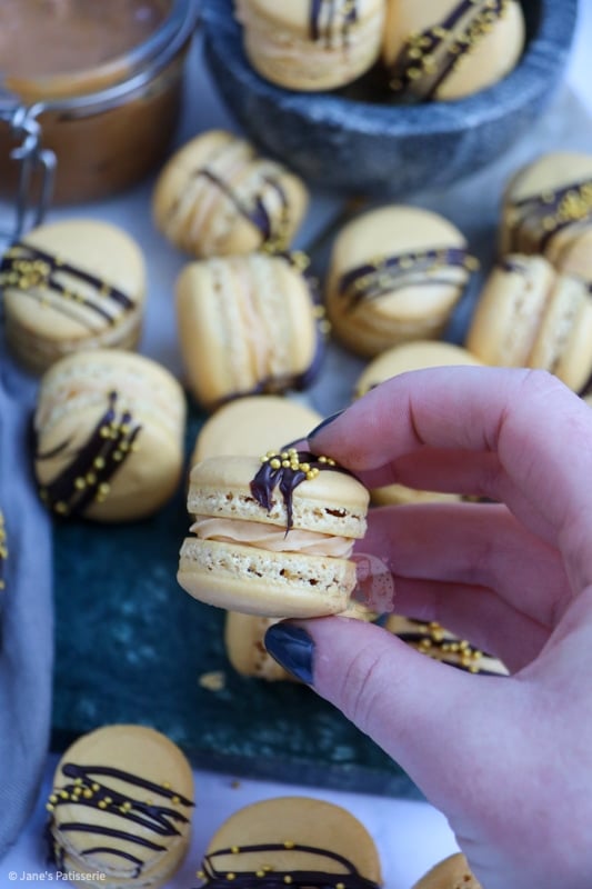 Salted caramel macarons filled with a salted caramel frosting and hidden caramel centre – perfect delicious treat!