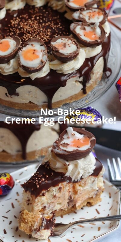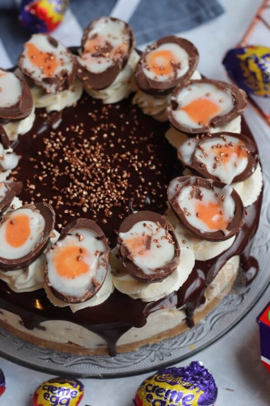 Delicious vanilla cheesecake, buttery biscuit base, SO MANY CREME EGGS, and a chocolate ganache drip… Hello no-bake creme egg cheesecake!