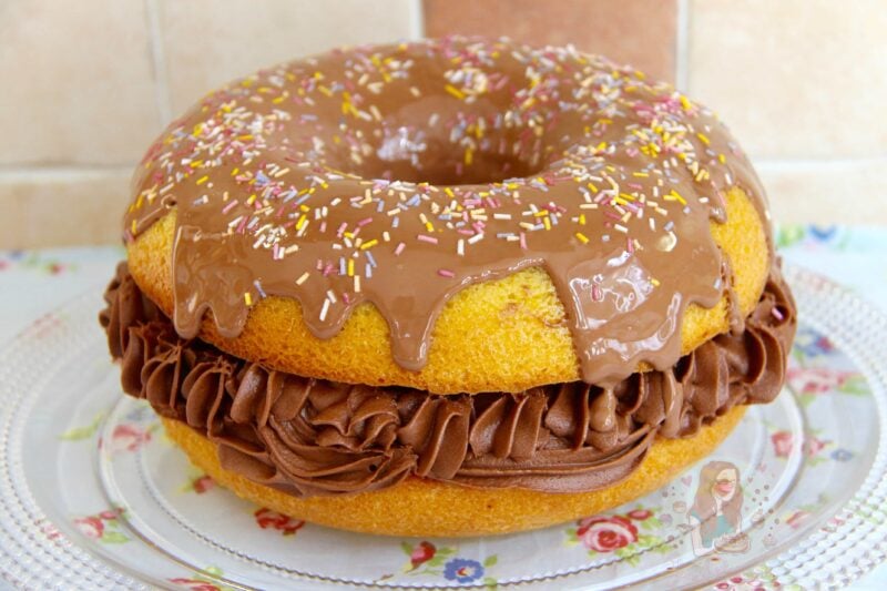 Anyway, I went for plain and standard vanilla sponge for my first giant doughnut recipe as I like the mix of vanilla and chocolate together. The filling is a light and fluffy chocolate buttercream frosting, and slathered with some melted chocolate for an extra little touch.