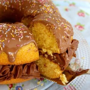 A GIANT Vanilla Doughnut Cake filled with luscious Chocolate Buttercream Frosting & Slathered with even more Chocolate.