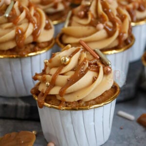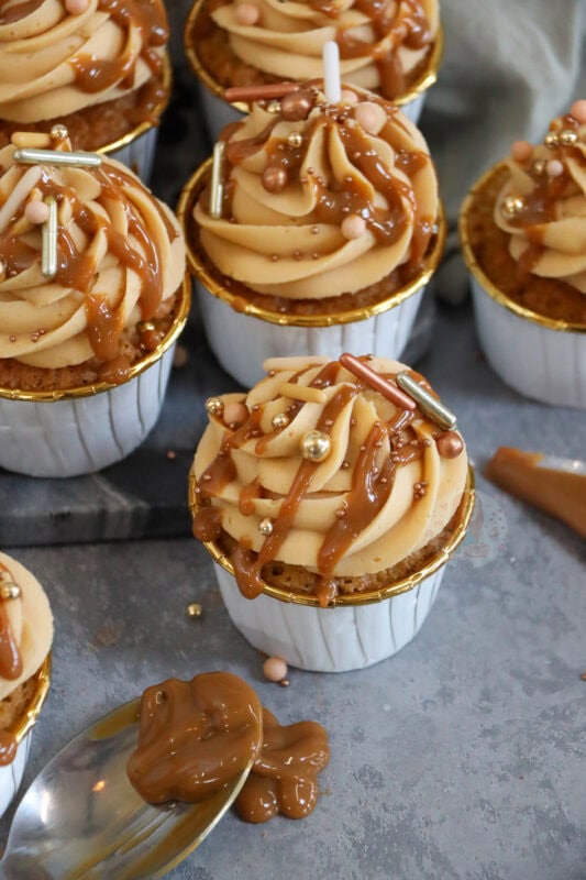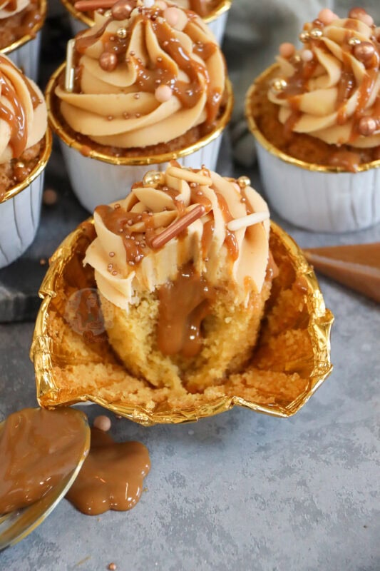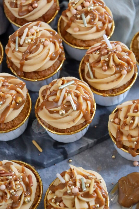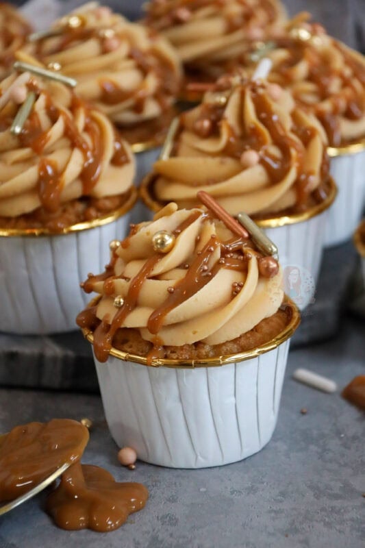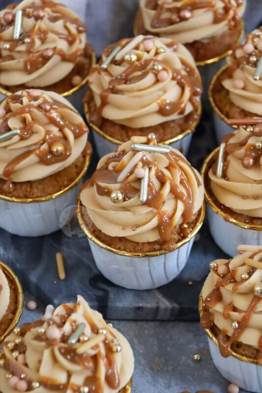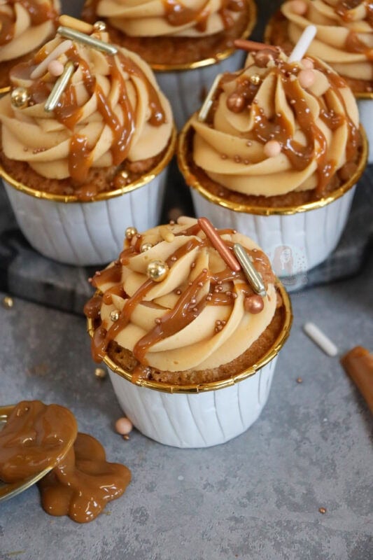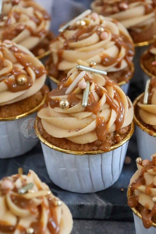 I use the salted caramel after I have cored out the cupcakes and filled the middle, I use it in the buttercream frosting, and I even drizzle it over the top as I really do go in on this flavour profile.