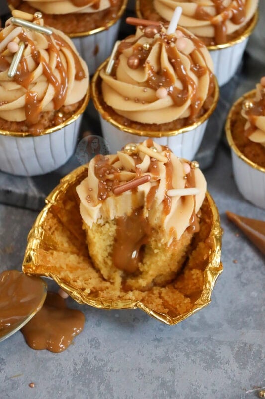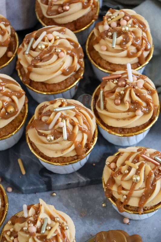 You guys loooove both a salted caramel and cupcake recipes – so ta daaaa! Similar flavours to my salted caramel drip cake, my more festive salted caramel pretzel cupcakes, salted caramel millionaires shortbread, and my no bake salted caramel cheesecake, i’m sure you guys will love this one!