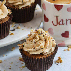 My carrot & walnut cupcakes are such an old recipe on this blog now that they’re rarely seen, but these will hopefully bring the walnut love back. If you like coffee cake then you will utterly adore these. One of my family friends literally CONSTANTLY says that she likes walnuts with her coffee cake, so these were made as her little birthday treat and they went down an absolute storm!