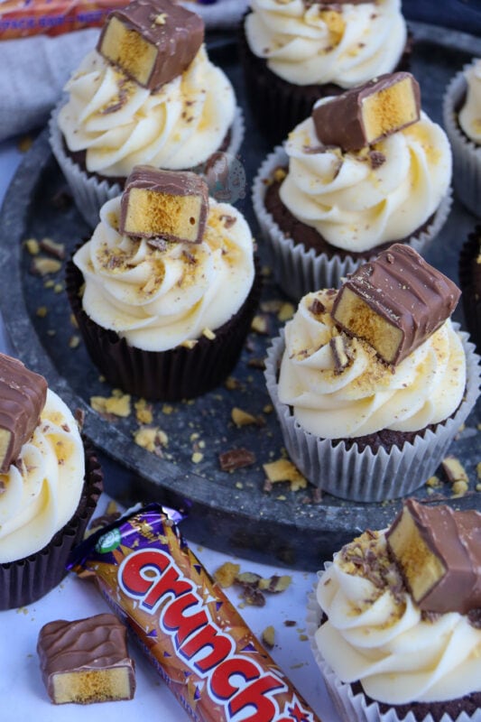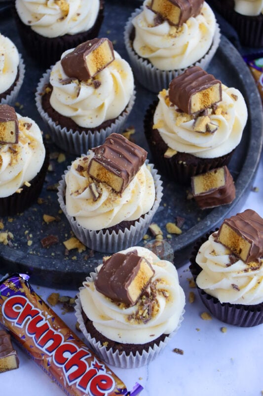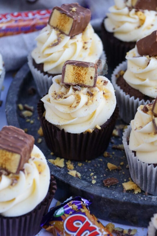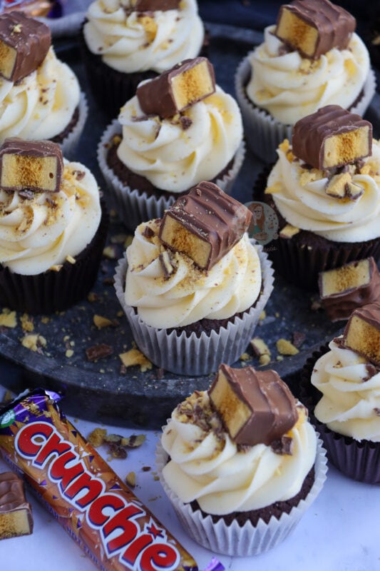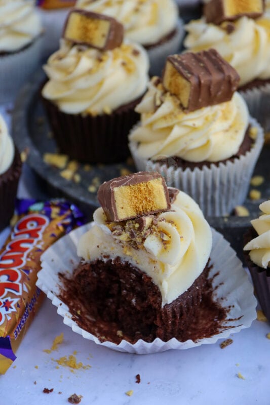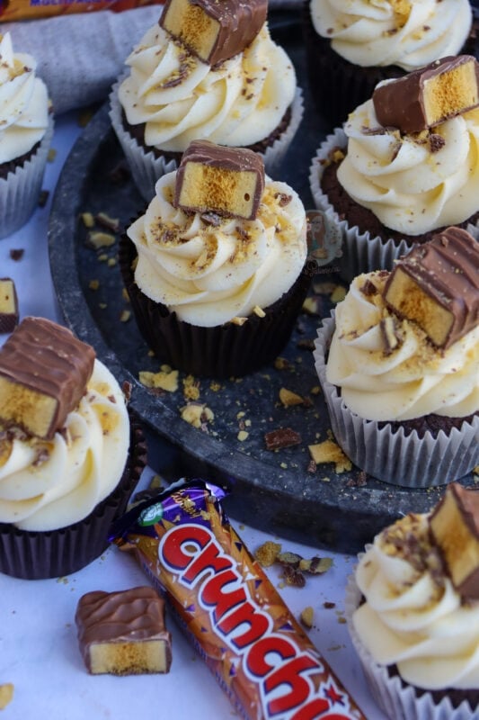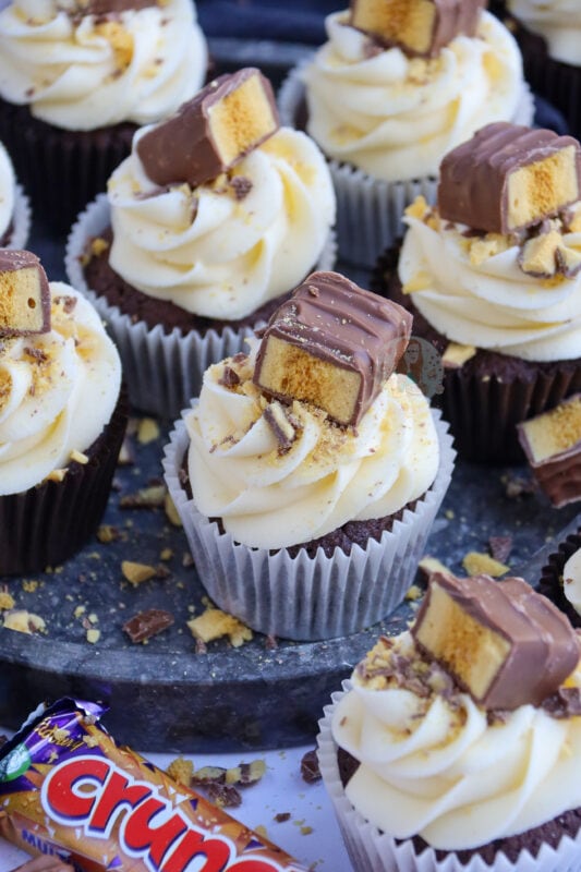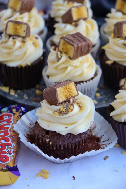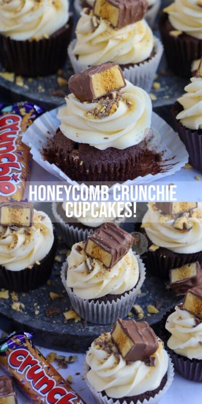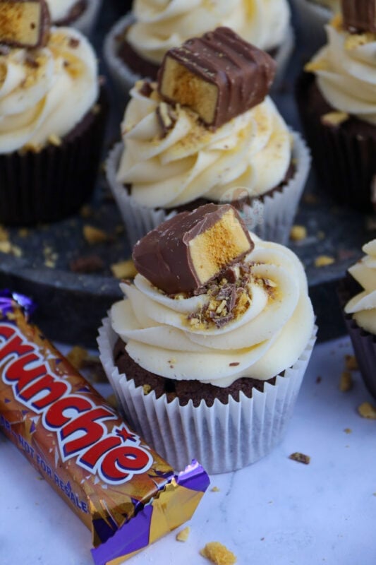 I wouldn’t recommend putting honeycomb pieces into the actual cupcake as they will just melt and might bake the cupcakes in an odd way, but you could on the other hand fold through crushed pieces of the Crunchie through the buttercream frosting if you’re not using a fine piping tip which would be nice (I just prefer them on top!).