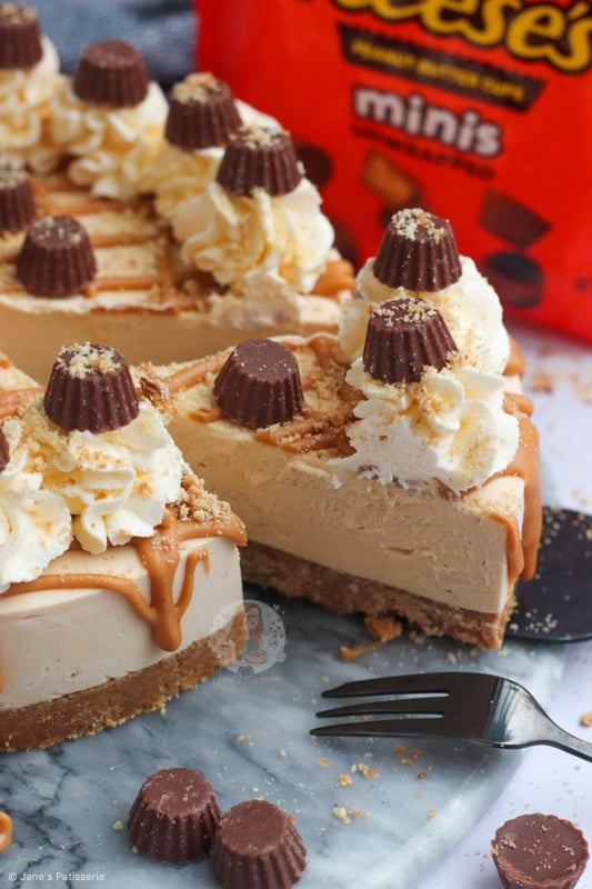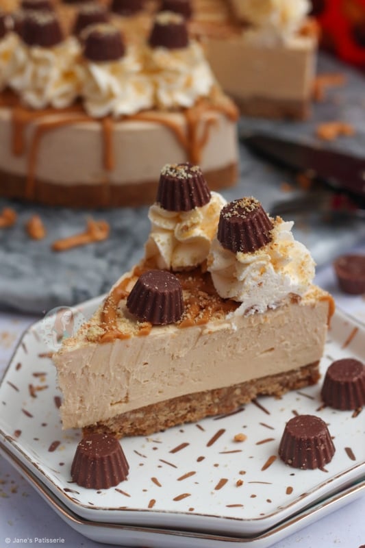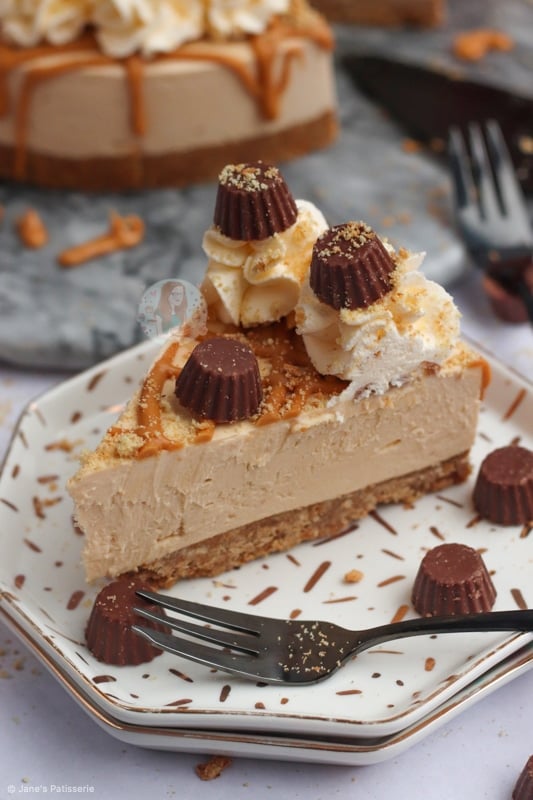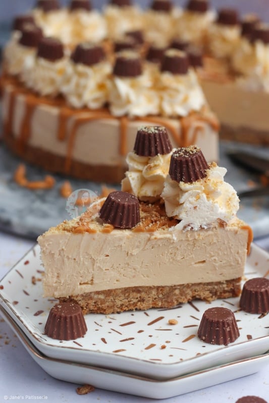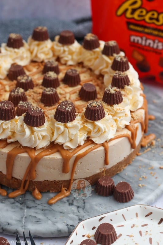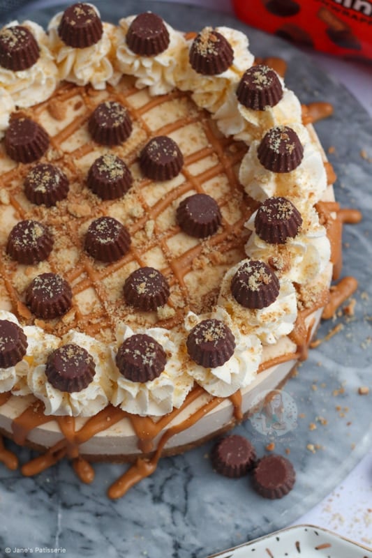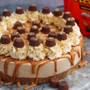A delicious, sweet & nutty no-bake peanut butter cheesecake with overload peanut butter decoration!