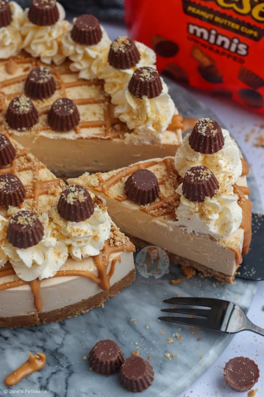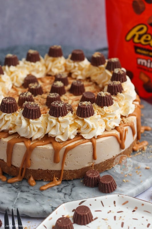 - Whip the double cream and icing sugar together until thick and pipe onto the cheesecake. Add peanut butter cups, and some sprinkles.