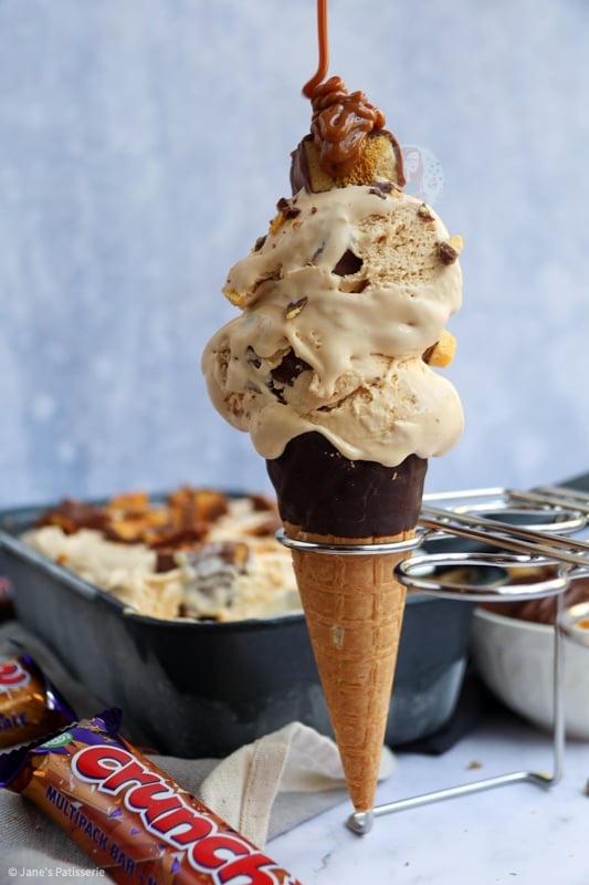 You can serve this in a waffle cone, a regular cone, in a bowl – with cream, with cake, with caramel sauce, with extra crunchie… there really is no end to it! Enjoy!
