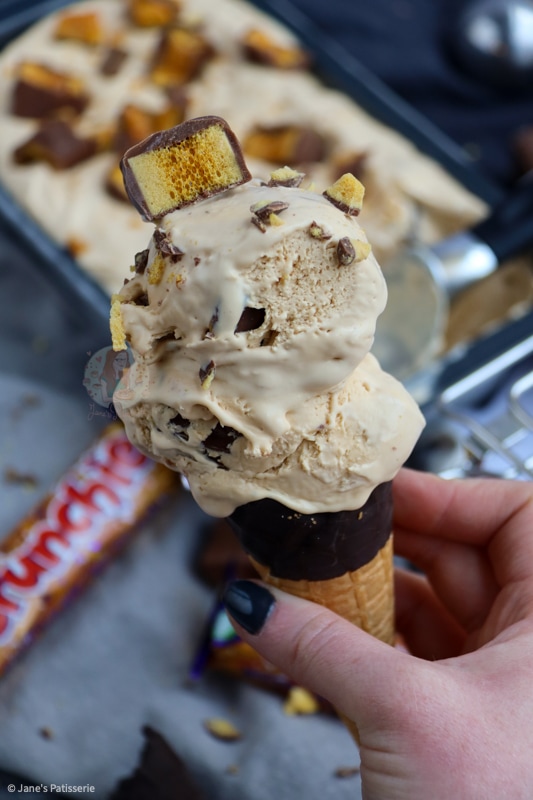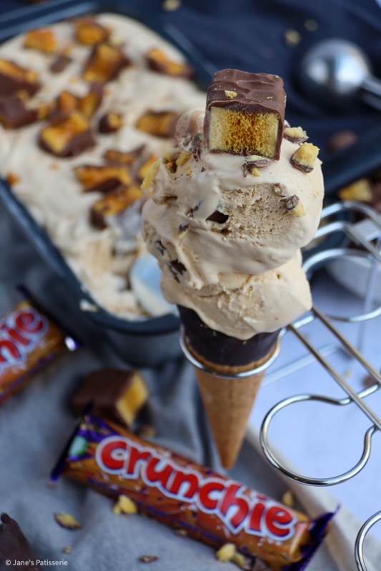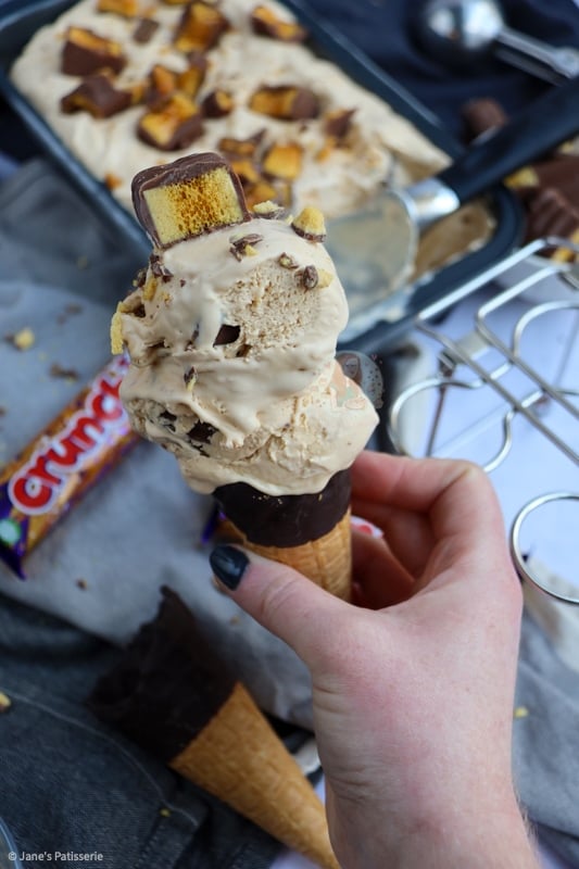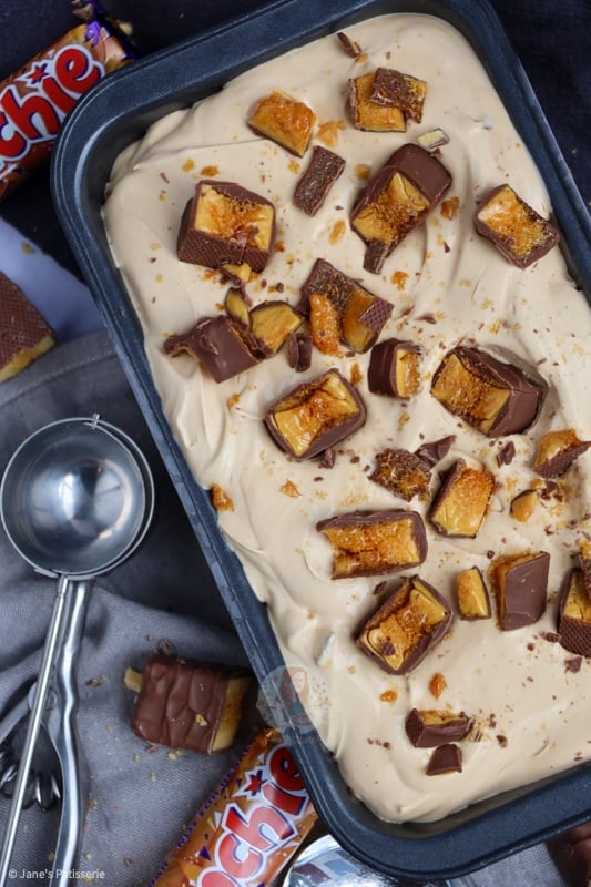 I based this recipe on my no-churn salted caramel ice-cream as that also had a base of the carnations caramel rather than condensed milk like my others. However, with the addition of honey and without the salt it made it taste slightly more honeycomb, and of course, the crunchies in every bite were damn delicious.