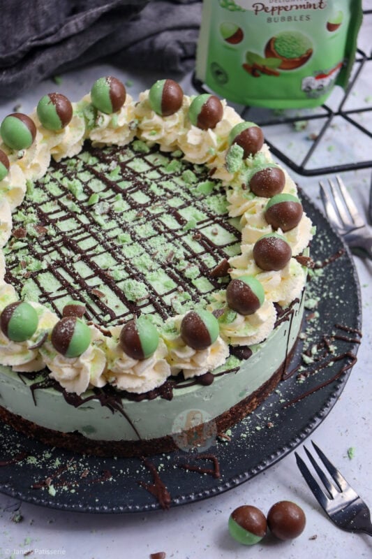 I tend to melt down a chocolate until smooth, then add it to a small piping bag and drizzle quickly in lines on top of the cheesecake. I then whip my cream with the icing sugar lightly to soft peaks and pipe that on top using my favourite piping tip and then I add on a lot of mint aero on top to make it a true showstopper.
